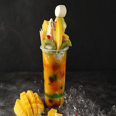 Pieces of fruit, fresh fruit juice, ice cream, and cake slices...